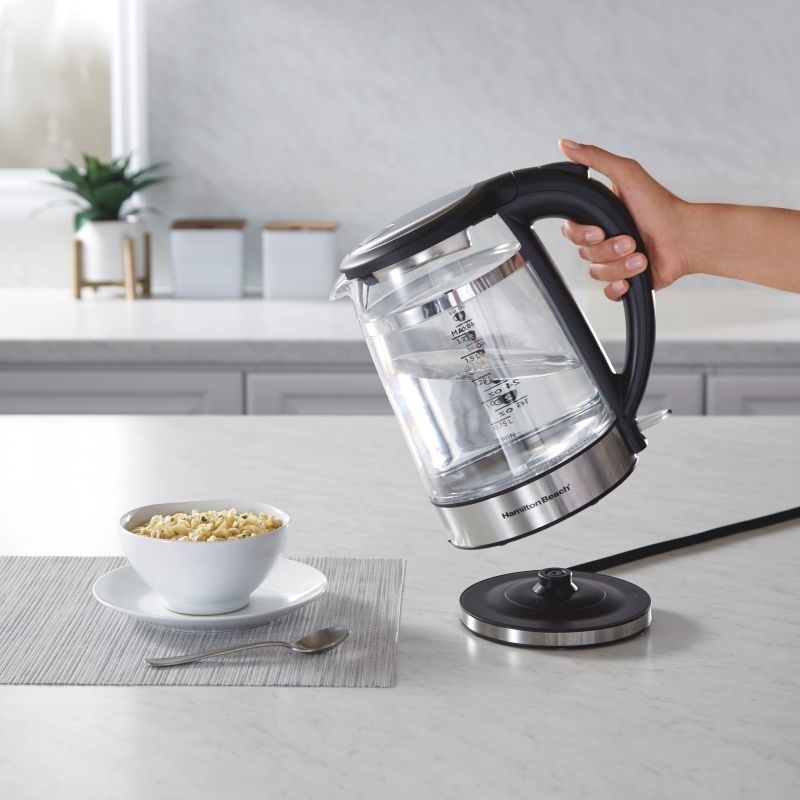 The Hamilton Beach® 1.7 L Double Wall Kettle keeps water warm 29% longer* and has LED lights that change color as the water heats up. Features a BPA-free glass and stainless steel interior, automatic shutoff and rapid boiling performance.